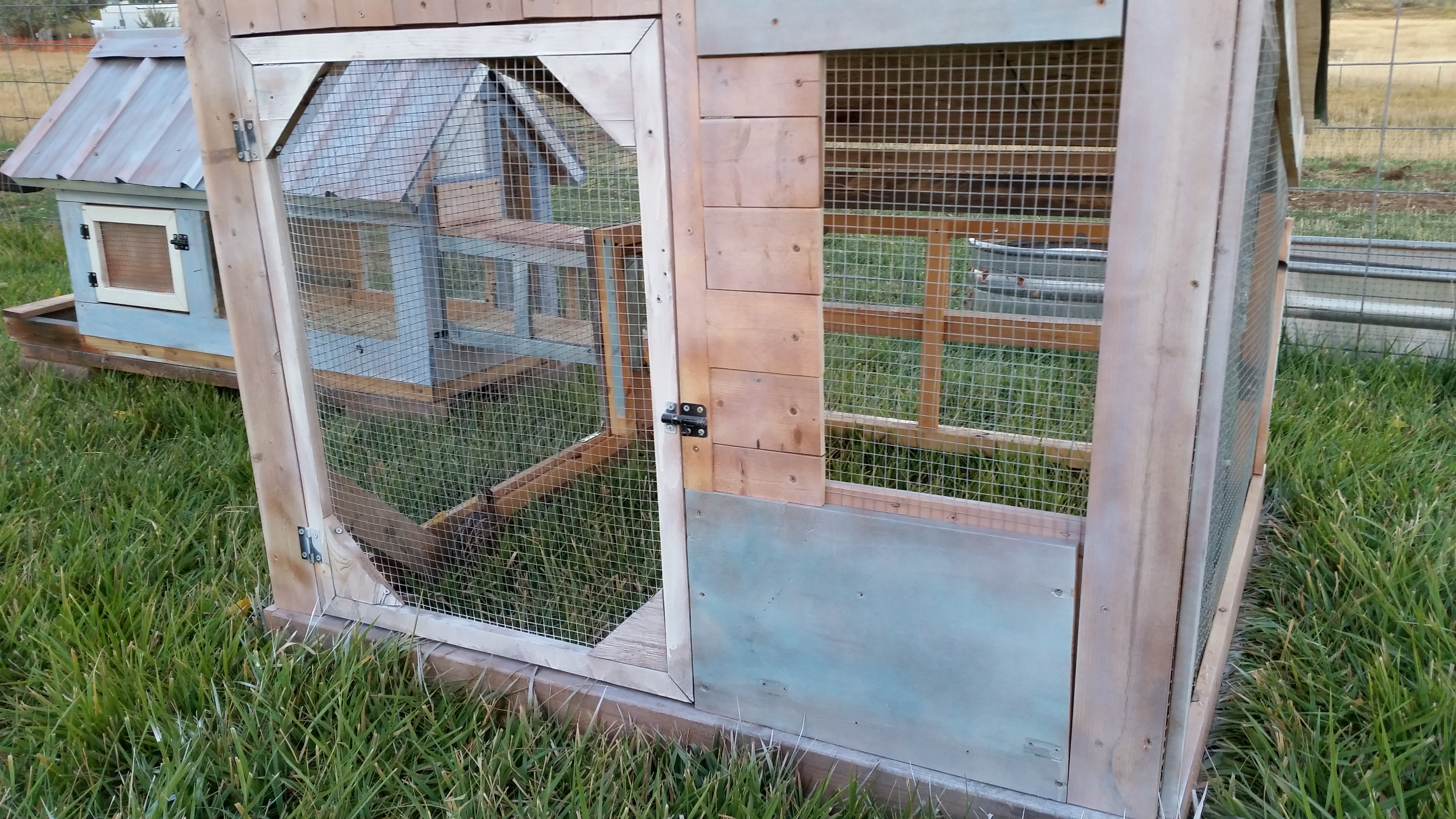 The run is 4 feet by 4 feet, and about 4 feet tall with a steep roof for snow loading. It is wrapped in 1/2 inch hardware cloth, and has a large door for ease of human access. A small 2 foot bridge connects the run to the coop. The coop is 1.5 feet by 4 feet, with a steep roof, a door, and 2 large plexiglass windows. The coop also has a hardwired bulb for warmth, and the quail water will utilize a thermostatic heating element to keep from freezing.